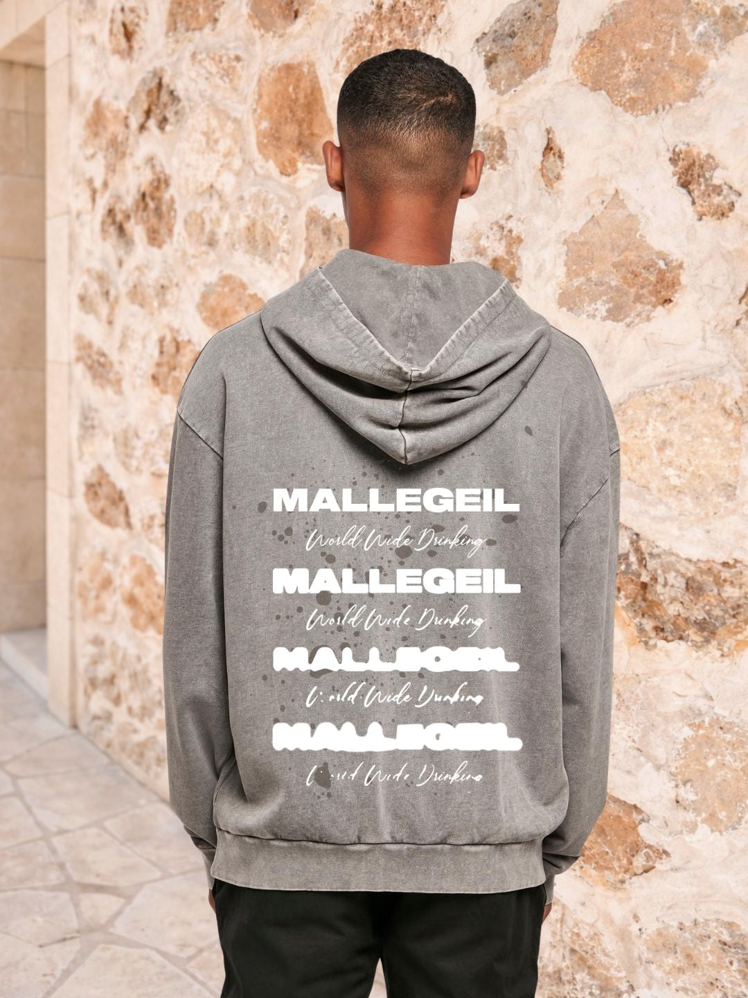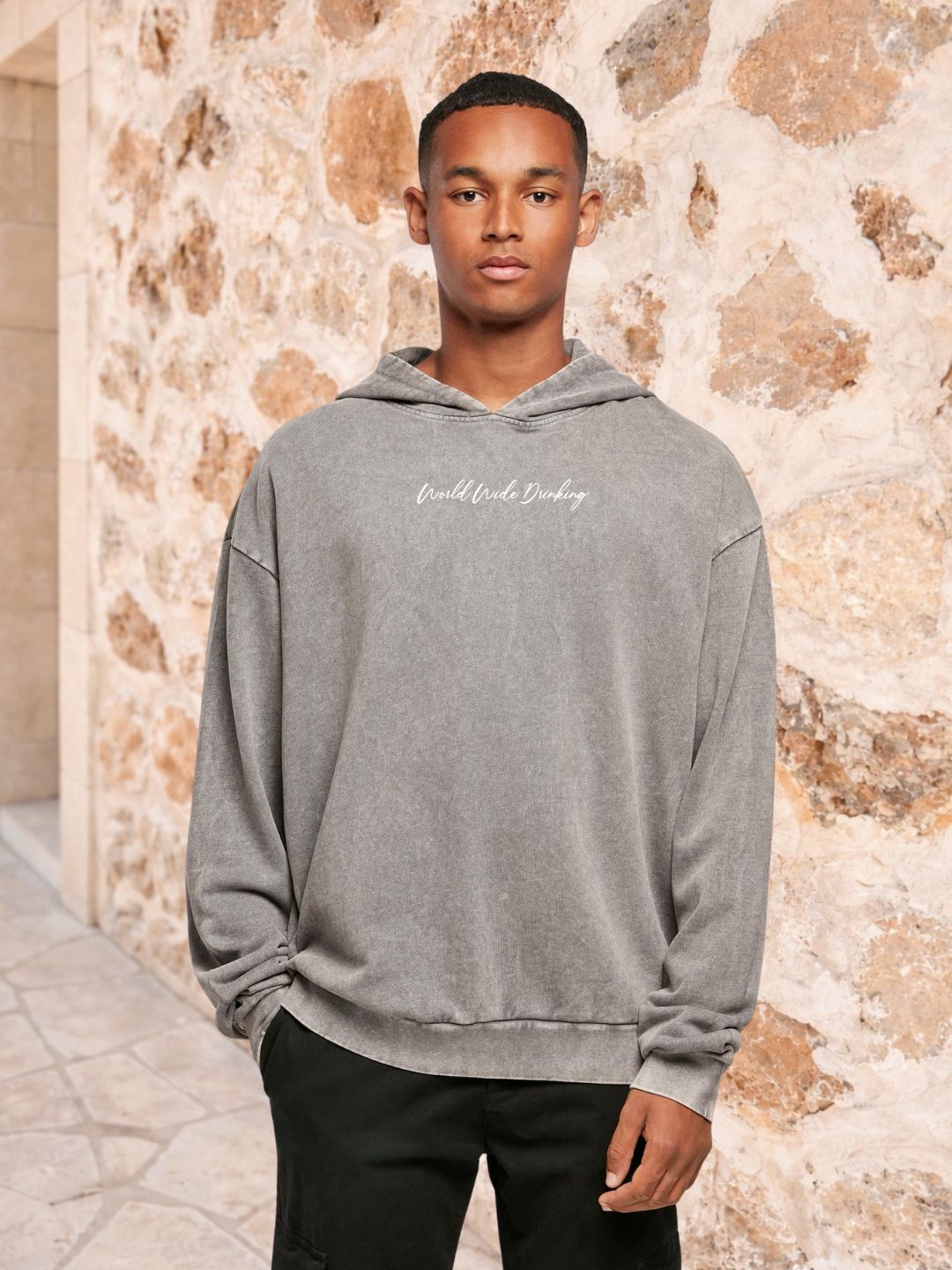 unisex hoodie washed asphalt 'world wide drinking white'